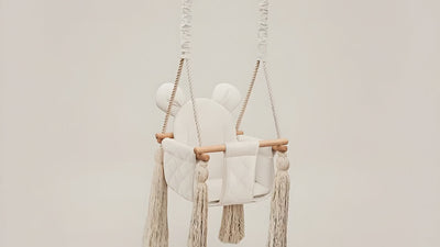 Gefertigt aus robustem Holz, handgeflochtenen Baumwollseilen und weich gepolstertem, gestepptem Samt (Velvet), überzeugt die BabySteps® Schaukel sowohl durch ihre Funktionalität als auch durch ihr stilvolles Erscheinungsbild. Verspielte Öhrchen und Quasten verleihen ihr einen charmanten Look, der jedes Kinderzimmer verschönert.